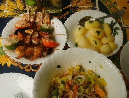 Gorące szpadki ułożyłam na talerzu z marynatą, a właściwie ze smacznym sosem oliwno-cytrusowym (można go zaostrzyć pieprzem). Obok nich postawiłam połówki limonki i mandarynki wypełnione gotowymi sosami majonezowymi. W limonkach był czosnkowy, w mandarynkach łagodny, różowy. Sałatę przyprawiłam oczywiście tuż przed postawieniem na stole. Warto do tych sosów podać pieczywo. Ale ja podałam ziemniaki. Można je tu dostać w słoikach; są gładko i pięknie obrane, już ugotowane, sprzedawane w osolonej zalewie. Mało to ambitne, ale na campingu komu by się chciało stać przy kuchni?! Nie mnie.