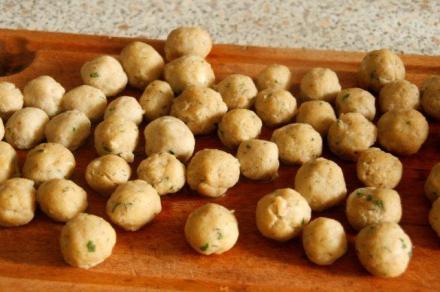 3. Mokrymi rękami formować kuleczki średnicy 2 cm i układać na blachę do pieczenia [? można także na deskę zwilżoną zimną wodą]. (…)