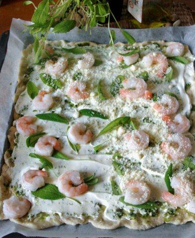 Najpierw utrzeć sos pesto w mikserze lub moździerzu. Do ziół, czosnku, sera i orzechów dodawać po trochu oliwę. Pesto musi mieć konsystencję dobrą do rozsmarowania (nie może być zbyt rzadkie). Przyprawić solą i pieprzem. Ciasto na pizzę przyrządzić jak zwykle lub – jeżeli sami go nie zagniatamy – kupić gotowe. Ułożyć je na blaszce, na rozłożonym papierze do pieczenia. Placek posmarować najpierw pesto, potem śmietaną, na niej ułożyć listki szałwii. Wszystko posypać parmezanem. Piec 20 minut w 220 st. C.