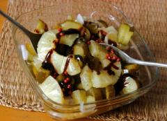 Do obu klopsów podałam sałatkę łączącą dwa smaki. Oto jej składniki: kiszony ogórek (nie obieram ze skórki, ale można, zwłaszcza jeżeli twarda), kostki ananasa (dwa większe półplasterki można zostawić dla dekoracji), posiekana cebulka. Przyprawiłam wszystko olejem słonecznikowym i gęstym octem balsamicznym o smaku cytrynowym oraz kuleczkami czerwonego pieprzu.