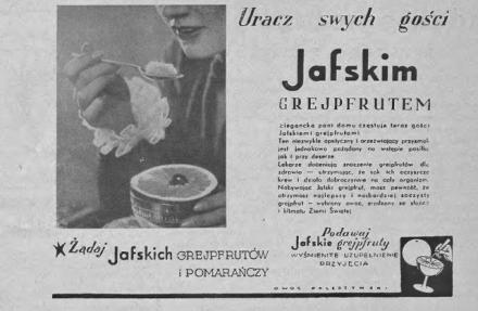 „Jak rozpocząć i jak zakończyć” – taki tytuł ma ten artykulik z tygodnika (chyba kryptoreklamowy; rzeczywiste reklamy owoców z Palestyny pojawiały się w kolejnych numerach pisma). Teza tekstu dość banalna: grejpfruty mają walory zarówno gdy się je podaje na śniadanie (podobno gwarantują udany dzień!), jak i podczas kolacji. „Niektórzy rozpoczynają dzień wypiciem szklanki świeżo wyciśniętego i przecedzonego soku z grejpfrutu. Jest to bardzo dobry napój, ale sam owoc grejpfrutu jest tak bardzo smaczny, że szkoda jest nie rozkoszować się nim w całości, zwłaszcza, że przyrządza się go bardzo łatwo. Do tego celu służą specjalne, małe nożyki z zagiętem ostrzem, którem ślicznie się rozdziela owoc na cząstki, tak że można je wyjąć małą łyżeczką”. Nożyk miałam, ale komuś podarowałam, bo także zwykłym nożykiem do owoców można wnętrze jego połówek porozdzielać wzdłuż białych błonek.