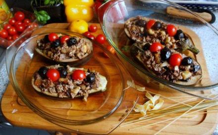 Z oliwek najpierw usunęłam pestki. Bakłażany wydrążyłam, połówki nasoliłam i pozostawiłam. W tym czasie posiekałam wyjęte z nich środki. Na patelni rozgrzałam oliwę, obsmażyłam posiekaną cebulę i mięso, a następnie środki bakłażanów i posiekane pomidory. Przyprawiłam ziołami, solą i pieprzem, dodałam kilka oliwek drobno posiekanych.