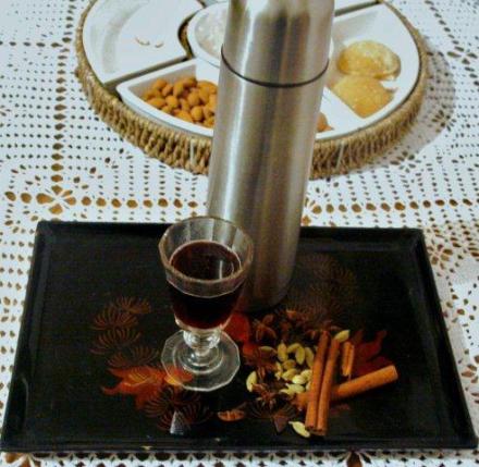 Wino mocno zagrzać z korzeniami w rondelku z pokrywką. Wlać do termosu.