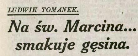 Dlaczego na świętego Marcina piekło się w Polsce gęś? I czy tylko w Polsce? Wyjaśnia tekst z roku 1932, który zamieścił „Ilustrowany Kuryer Codzienny”. Autorem był redaktor Ludwik Tomanek (1891–1942 lub 1943 w Auschwitz; co brzmi tragiczne przy temacie tego właśnie tekstu!), dziennikarz, redaktor w „IKC”. To ciekawa postać i znana przed wojną w Krakowie. Zanim został dziennikarzem, był profesorem w gimnazjum. Popularyzował wiedzę, zwłaszcza chemię. Był autorem monografii o Ignacym Łukasiewiczu, czytanej i dziś. Bardzo lubiane krótkie felietony i wierszyki w IKC, z których słynął, podpisywał Tommy. Współpracował z krakowskimi literatami, m.in. z Magdaleną Samozwaniec i Marią Pawlikowską (poprawiali razem jedną z jej sztuk).