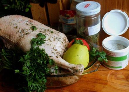 Dzisiaj dopiero przygotowałam gęś do pieczenia. Nie kupowałam dużej, wbrew radom sprzedawczyni z Hali Mirowskiej (można tam dostać tzw. gęsi ekologiczne – 40 zł za kilogram, a wyglądają jakby ważyły z siedem kilo!). Kupiłam mniejszą, mrożoną, ale za to z podrobami schowanymi w tuszce. Z resztek piór ptaka opaliłam opalarką. Podroby zmełłam, wraz z dwoma jajami, czterema łyżkami tartej bułki, rodzynkami jasnymi, natką pietruszki, solą i pieprzem. Nadziałam tuszkę. Natarłam gęś ziołową mieszanką (z ziół samodzielnie ususzonych, czuję w niej miętę i cytrynową bazylię) oraz tzw. kwiatem soli. Wstawiłam do lodówki. Przygotowując farsz tuż przed pieczeniem (tak najlepiej robić, ale nie zawsze jest na to czas; przewiduję, że jutro polecę na Plac Piłsudskiego!) dodajemy do niego żółtka i pianę ubitą z białek. Nie zapomnijmy o jabłkach. Gęś je kocha, a one kochają gęś. Można tylko nimi nadziać tuszkę.