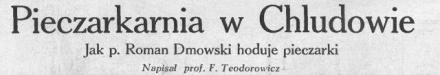 A nawiązując w opowiadaniu tem do twórczej pracy ludzkiej, wskazuję Francuzów, którzy od wieków hodują umiejętnie na olbrzymią skalę pieczarki, jako tych jedynych, którzy nazwani być śmiało mogą „ludzkiem: attinami”. W Polsce jednym z pierwszych, którzy sprawę hodowli francuskich pieczarek podjęli na większą skalę, nie dla materjalnej korzyści, lecz tylko dla idei, jednym z pierwszych, którzy hodowlę tę przeprowadzili ściśle i zapobiegliwie, nie jako zabawkę lub eksperyment, lecz wyłącznie dla propagandy, był Roman Dmowski z Chludowa. Tam to powstała jego piękna pieczarkarnia. W dwóch niewielkich ubikacjach suterenowych, ogrzewanych centralnie, ogrodnik p. Jan Wawrzyniak, założył w myśl moich instrukcyj hodowlę. W dniu 15 sierpnia 1928 wysłano łożyska w dwóch kondygnacjach przemacerowanym nawozem. Powierzchnia hodowlana mierzyła 25 m kw. , na niej zapikowano 18 września francuską grzybnię; lecz pierwsze pieczarki skutkiem nie opalania przez czas dłuższy lokalu ukazały się dopiero z końcem listopada. Lecz znów z powodu popełnionych błędów czekać trzeba było 3 tygodnie na produkcję normalną. Rozpoczęła się 21 grudnia; odtąd już co trzeci, czwarty dzień zbierano pieczarki. Dziwna rzecz! Grzyby były tak dorodne, tak jędrne i słodkie, że zdobyły rekord ponad pieczarkami harcerzy rawickich! Nawet detaliści poznańscy wzbraniali się je zrazu przyjmować z obawy, że publiczność nie zechce kupować takich kolosów w podejrzeniu, iż to może jakieś grzyby trujące! Po koniec marca 1929 zebrano z chludowskiej hodowli 86 funtów pieczarek, co według ceny dzisiejszej przedstawia dochód w kwocie 516 zł.