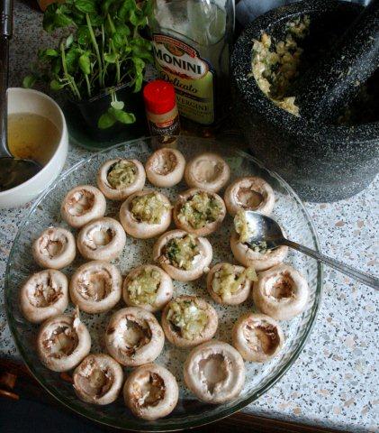 Pieczarki oczyścić starannie, ponieważ się nie zdejmuje skórki. Jeśli są myte, osuszyć. Wyciąć uważnie trzonki, aby uniknąć pęknięcia kapelusza lub przedziurawienia (uszkodzone grzyby odłożyć np. do jajecznicy lub dodać do zupy czy mięsa). Posiekać trzonki, cebulę i czosnek oraz bazylię (mogą być inne zioła lub natka pietruszki). W moździerzu rozetrzeć siekaninę z solą i pieprzem na pesto (nie musi powstać papka), dolewając oliwę. Kapelusze grzybów wypełnić farszem, ustawić w naczyniu posmarowanym oliwą. Zapiekać, aż grzyby przestaną być surowe, ale nie za długo, 15-20 minut w 180 st. wystarczy.