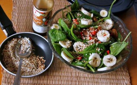 Szpinak dokładnie opłukać, odwirować w suszarce do sałaty lub osuszyć dokładnie. W salaterce wymieszać z posiekaną chili, przełożyć plasterkami banana. Przyrządzić winegret z podanych składników. Polać nim sałatkę tuż przed podaniem lub wręcz już przy stole. Posypać ziarnami sezamu zazłoconymi na suchej patelni (trzeba mieszać i uważać, bo szybko się palą). Skropić olejem sezamowym.