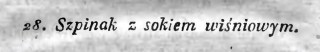 Wziąść [tak, ale to już wtedy był błąd] pół funta masła, włożywszy go do rondla, wsypać pół funta miałko tłóczonego cukru, dodać cztery żółtka syrowe, kwaterkę pszenney mąki, wymięszawszy to wszystko; wlać kwartę gęstey kwaśney śmietany, (uważać należy gdyby była świeża) i zagotować ciągle mięszając. Zdjąwszy z ognia włożyć kwartę szpinaku odgotowanego oraz wyciśnionego z wody i miałko usiekanego; dodać dwanaście syrowych żółtków, i piankę z dziesięciu białek; wymięszawszy wszystko razem, włożyć do formy, która powinna bydź [regionalizm?] wysmarowana klarownem masłem i cukrem wysypana. Wstawiwszy formę do pieca miernie ciepłego, gdy się w nim upiecze, szpinak wyjmuje się i wykłada się na półmisek; polawszy sokiem wiśniowym wydać do stołu.