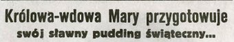 Tak samo i w ubiegłym roku, jak za dawnych lat, królowa Mary osobiście nadzorowała przygotowanie świątecznego puddingu wedle swej dawnej recepty. Czynności przygotowawcze trwały przez cale trzy tygodnie. W wieczór wigilijny gotował się jeszcze pudding windsorski przez dwie godziny w kipiącej wodzie, a w chwili podawania polany został koniakiem, zapalony i tak płonący ustawiony na stole świątecznym.