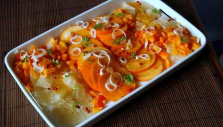 Tę mączność i mięsność można przełamać sałatką. Proponuję krok w stronę szaleństwa. Wieprzowina lubi smak owoców egzotycznych. Nie zapominajmy, że to ulubione mięso kuchni Dalekiego Wschodu i Wysp Oceanii (tych, gdzie nie panuje islam). Podstawą sałatki uczyniłam pomarańczowe kaki, inaczej nazywane szaronem (lub persymoną).