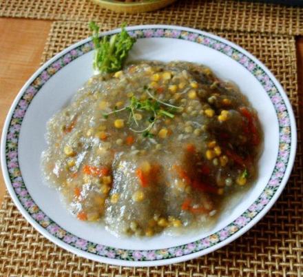 Do przygotowania drugiej wykorzystano resztki gotowanej ryby (ale może być i smażona, i pieczona, byle bez sosu). Wywar rybny z kostki (zawsze przywożę takie kostki rybne z podróży, u nas – nie wiadomo dlaczego – się nie pojawiają). Tu został zestalony nie żelatyną, ale agarem, aby galaretkę mogły jeść osoby nie jadające mięsa. Po jego zastosowaniu uzyskuje się galaretkę delikatniejszą, miękką, konieczne jest jej zastudzenie i przechowywanie w lodówce. Dodatkiem do niej były warzywa z puszki: drobny groszek i kukurydza.