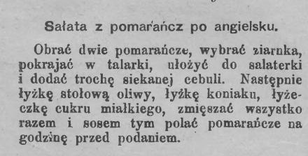 A może jakaś sałatka do tych galaret? Pewnie zostały także kupione kilka dni temu cytrusy. Oto pomysł na ich wykorzystanie z roku 1902, z warszawskiego pisma „Dobra gospodyni”. Dział kulinarny prowadziła w nim Jadwiga Izdebska, autorka jednej z popularnych wtedy książek kucharskich. Swoją drogą, ile ich było! Wszystkie znakomite. Swoje kulinarne credo – a chyba i wszystkich tych wspaniałych dam, piszących wtedy o kuchni – zawarła ona w przychylnej recenzji książki swojej wszak konkurentki (!); poczytajmy (zachowuję ortografię epoki):