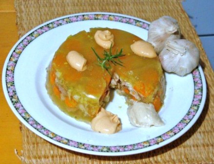 Jedna była zrobiona z resztek pieczonego drobiu na resztkach rosołu i została zestalona żelatyną (według przepisu na opakowaniu). Pamiętajmy, że kupną żelatynę robi się ze składników zwierzęcych. Dodatkiem do tej galarety były jarzyny z rosołu. Do wywaru można użyć różnych przypraw, w tym np. dać przeciśnięty czosnek.