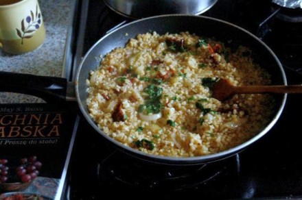 Poszłam tropem kaszy. Burgul już tu wspominałam. Ktoś odniósł się do pisowni tej nazwy. Jest spolszczona. „Larousse gastronomique” nazywa tę kaszę z pszenicy: „boulghour” lub „bulghur”. Wiadomości o niej (i pisownię) podaję za książką pt. „Kuchnia arabska. Tafadalo! Proszę do stołu!”, autorstwa May S. Bsisu, w tłumaczeniu Marcina Stopy. Zaczerpnęłam z niej podstawę do sporządzenia grubego burgulu na ciepło (drobny wystarczy zalać wrzątkiem, jak kuskus). Bardzo mi zasmakowała ta kasza. W konsystencji jest podobna do tak lubianego przeze mnie risotto, ale wyrazistsza w smaku, orzechowa i intrygująca.