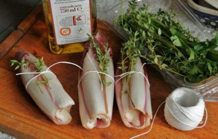Cykorie oczyścić z liści zwiędniętych lub uszkodzonych. Z każdej wyciąć głąb. Aby się nie rozpadły podczas duszenia, można je obwiązać nicią kuchenną (patrz: zdjęcie niżej). Pod każdą nić można włożyć gałązkę tymianku. Jeżeli nici brak, tymianek po prostu wyłożyć obok duszących się warzyw. Na patelni rozgrzać olej, obsmażyć cykorie z każdej strony, posolić lekko. Przykryć patelnię pokrywką, cykorię dusić 15–30 minut. Czas zależy do tego, czy wolimy warzywa miękkie, czy twardsze. Gdyby cykoria nie puściła dość soku, można kapnąć nieco wody lub białego wina. Pod koniec duszenia dorzucić wyłuskane orzechy.