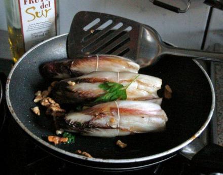 To wszystko. Orzechy i zioła można dać inne. A może dodać nieco rodzynków? Ich słodycz może zrównoważyć gorzkawy smak cykorii. Tę gorycz nie wszyscy lubią, ale dla smakoszy jest intrygująca. Niektóre przepisy zalecają duszenie cykorii w większej ilości wywaru warzywnego lub drobiowego. Moim zdaniem nie jest to potrzebne. Ale: de gustibus…