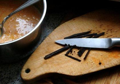 Korzystałam z zamrażalnika i mieszałam co jakiś czas sorbet za radą Alicji B. Toklas. Do mojego sorbetu wzięłam: trzy mandarynki (z nich otarłam skórkę) i jedną limonkę. Śmietany bitej mniej. Dodałam także ziarenka wanilii, nożem otarte z jej laski. Jak na zdjęciu.