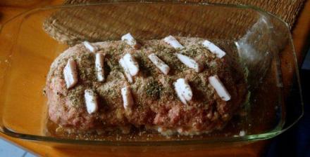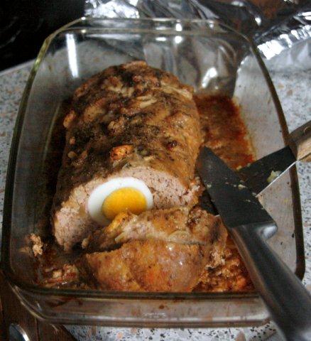 Kilo mięsa zrazówki, lub białej pieczeni (skrzydła) i kawałek tłustej wieprzowiny od karku przepuścić przez maszynkę z dwoma namoczonemi i wyciśniętemi bułkami. Zasmażyć pół tartej cebuli z masłem, dodać do mięsa, wsypać trochę pieprzu, soli, dwa całe jaja i wyrobić doskonale, gdyż od tego zależy, aby mięso ściśle się trzymało. Osobno ugotować dwa lub trzy jaja na twardo, kawałek słoniny i pokarajać słoninę na paski, a jaja na cząstki. Rozpłaszczyć mięso na stolnicy, ułożyć na nim słoninę i jaja naprzemian [tak wtedy pisano], zwinąć następnie w długi i szeroki wałek, urobić w mące i obsmażać naokoło na rozpalonem maśle. Potem wstawić do pieca, podlać smakiem z grzybków, piec przez godzinę, a w końcu wlać ćwierć litra kwaśnej śmietany ubitej z pół łyżeczką mąki. Podając pokarajać w plastry i obłożyć kartoflami przysmażonymi.