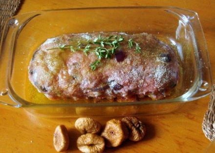 Cebulę pokroić drobno, zeszklić w oliwie. Bułkę namoczyć. Figi pokroić w paseczki. Mięso bardzo dokładnie wyrobić (wyjaśnienie w przepisie Monatowej) z przestudzoną cebulą i przyprawami. Dłońmi zmoczonymi zimną wodą uformować klops, wygładzić go, uciskając i wygładzając powierzchnię. Na wierzchu ułożyć gałązkę tymianku. Piec w temperaturze 180 stopni ok. 40 minut (patyczkiem sprawdzić, czy upieczony ; gdyby się za mocno rumienił, przykryć folią al). Podczas pieczenia można kapnąć do naczynia troszkę wody, podlewać nim klopsa, zwłaszcza gdyby się wydał za suchy.