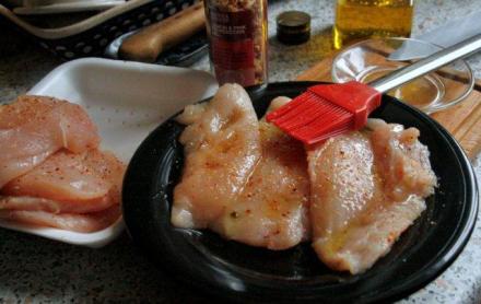 Piersi kurczaka pokroić na mniejsze kawałki. Lekko opukać trzonkiem noża. Posypać przyprawą. Posmarować oliwą. Odstawić choćby na kwadrans. Smażyć przez kilka minut z każdej strony na mocno rozgrzanej patelni grillowej (latem można na grillu na węgiel drzewny).
