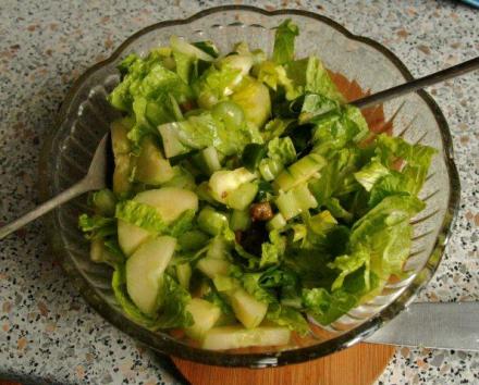 Sałatę myć, osuszyć, porwać na drobne kawałeczki. Seler umyć, ew. usnąć z niego włókna, pokroić. Ogórek umyć i obrać albo nie, pokroić w półplasterki. Warzywa wymieszać, skropić olejem wraz z ew. przyprawami (w słoiczku pomidorów były kapary).