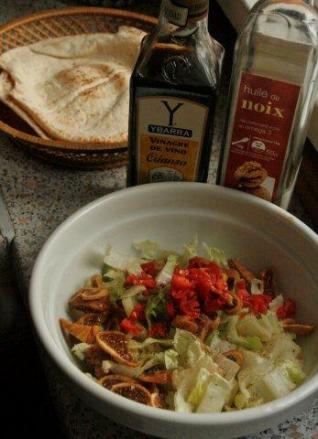 Staram się do obiadu podawać jedną jarzynę gotowaną, drugą surową. Taką nazywano w dawnej kuchni sałatą, była np. sałata z gotowanych selerów, ale i z surowych pomidorów. Moja sałata składała się z: sałaty lodowej, posiekanego strączka chili, kilku fig. Doprawiłam ją olejem z orzechów oraz, umiarkowanie, dobrym octem winnym. Pieprz, sól, odrobina cukru dla przełamania smaku. To wszystko.