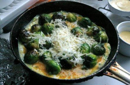 Brukselkę przygotować: obrać z żółtych listków, odciąć miejsce u nasady, zwykle brudnawe , obmyć, osuszyć. Rozgrzać oliwę (można dodać trochę masła; samo masło się przypala), wrzucić kapustki, obracając obsmażyć. Przykryć patelnię, brukselkę poddusić. Mieszać. Gdy kapusta już mięknie, lecz pozostaje jędrna, zalać ją jajkami wymieszanymi trzepaczką lub widelcem z solą, pieprzem i zieleniną. Smażyć, jak zwykle omlet, tzn. podważając brzegi, aby masa jajeczna spływała na spód patelni. Gdy wierzch zaczyna być zestalony, posypać startym serem. Można położyć na serze kawałeczki masła i patelnię na chwilę przykryć.