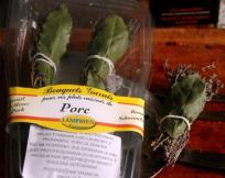 Mięsożercom przygotowałam duszoną wieprzowinę: małą golonkę przeciętą na pół (tak dogodnie przekrojone można kupić – kiedyś były tylko całe, olbrzymie golony) oraz żeberka (także są znacznie mniej tłuste niż były niegdyś). Choć, nie ma co kryć, wieprzowina to mięso tłuste z natury. Nie jemy go więc codziennie. Ale zimą, w dzień tak mroźny – pozwólmy sobie. Kawałki mięsa obsmażyłam po natarciu przyprawą francuską quatre-épices; te cztery składniki to: pieprz, gałka muszkatołowa, cynamon, goździki. (O przyprawie tu już pisałam). Mięso zyskuje dzięki niej niebanalny, ciepły zapach i smak. Do duszenia, po podlaniu bulionem (można winem lub wodą), dorzuciłam bouquet garni dedykowany wieprzowinie. Widać go obok. Banalne duszone żeberka tak aromatycznie przyprawione objawiają duszę jakiej byśmy w nich nie podejrzewali.