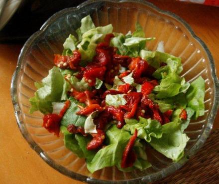 Aby tych mocnych akcentów (i kalorii) nie było za wiele i aby rozjaśnić stół, zrobiłam sałatę w dwóch zdecydowanych, mocnych kolorach: zielona sałata plus opieczona czerwona papryka, pozbawiona skórki i pocięta na paseczki.