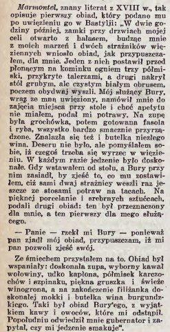 Fragment z przywołanego artykułu dotyczy pewnego mitu, mitu Bastylii. Nie były to lochy, w których więźniów przykuwano kajdanami do wilgotnych ścian. Żelazna maska była tak naprawdę jedwabną. A kuchnia? Tak żywiono więźniów:
