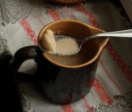 2 szklanki razowej mąki żytniej zaparzamy wrzącą wodą, lejąc jej tyle, by uzyskać rzadkie ciasto. Gdy ostygnie, dolewamy litr letniej wody i wkładamy skórkę chleba razowego. Przelać do szklanego słoja, obwiązać gazą i postawić w ciepłym miejscu. Po trzech dniach ‘biały barszcz’ będzie gotowy do użycia”. Do kiszenia takiego barszczu ja dodałam ząbek czosnku. (Aha, na etykiecie mąki jest przepis zakiszenia, nieco inny niż podany wyżej, bez zaparzania mąki).