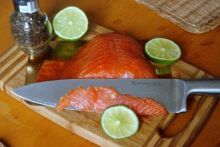 Ale dziś łososie są w różnej, każdej właściwie, postaci. Także wędzone. Słyszałam od kogoś, że najlepsze są te szkockie. Trochę droższe, ale może smak wynagradza cenę? Prawdę mówiąc, nie wiem. Wykazując się ignorancją kupuję takie, które mi się podobają z wyglądu. Lubię przy tym nie te krojone w papierki cieniutkie jak papier – choć mają swoje zalety – ale te w kawałku, które można kroić samemu. Lubię je podawać bez zadęcia, na desce, z ostrym nożem. Obok daję cytrynę lub limonkę i młynek z pieprzem lub z chili.