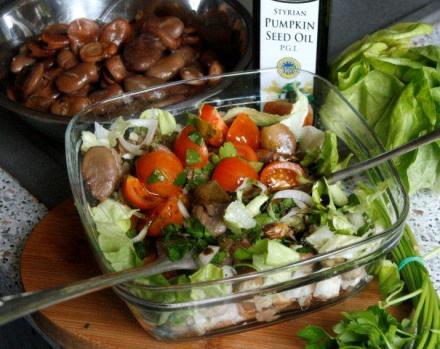 Tę sałatę przyprawiłam olejem z pestek dyni – ma ciemny kolor i znakomity smak. Warto się w niego zaopatrzyć. Najnudniejszą sałatę zamieni w coś intrygującego. Kto chce, doda kilka kropli winnego octu, o zdecydowanym smaku.