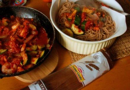Polubiłam spaghetti z mąki pełnego przemiału (integrali). Jest brązowe. Ma swój smak. A przede wszystkim – jest zdrowe. Gotuje się jak zwykłe. Podaje z sosem. Jak każdy makaron jest podstawą do wykonania potraw szybkich, z kilku składników. Dyżurne, które lubimy i które pozwalają gotować szybkie obiady, staram się mieć w domu. Pomagają się poratować, gdy wydarzenia nie mieszczą się w 24 godzinach dnia.