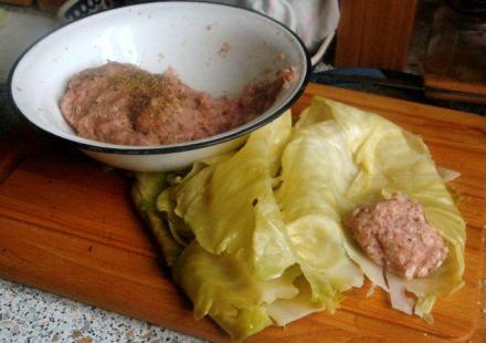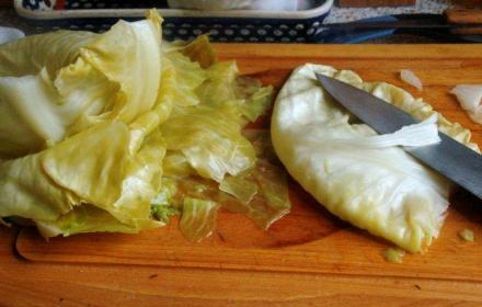 Najważniejsza rzecz: solidne obgotowanie główki kapusty i zdejmowanie z niej kolejnych liści do wypełniania farszem. Liście trzeba pozbawić twardego rdzenia, ścinając go nożem (jak widać na zdjęciu; można go też obtłuc trzonkiem noża, aby rozmiękczyć).