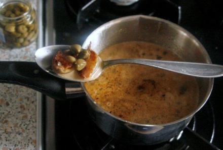 Rozgrzać patelnię po obsmażeniu mięsa, dołożyć szalotki i pieprz zielony z marynaty, wsypać pół łyżki mąki, dosmażyć ją w pozostałym tłuszczu. Zalewać po trochu bulionem i mieszać, aby powstał dość gęsty sos. Przecedzić go przez sito, aby odcedzić pieprz – jeżeli sos ma być podany osobom nie jadającym ostrych potraw. W zamian dodać przekrojone kapary i dorzucić szalotki wyłuskane z sita. Zaprawić sos śmietaną. Spróbować i raczej już nie solić, bo zwykle bulion jest słony. Sos ze śmietaną nie powinien się gotować. Należy tylko go podgrzać przed podaniem, co można bezpiecznie zrobić w mikrofalówce.