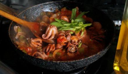 W rondelku rozgrzać oliwę, zmiękczyć posiekaną cebulę i selera, dodać pomidory obrane ze skóry, pozbawione pestek i pokrojone. Podduszone pomidory zalać chochlą gorącej wody lub wywaru z warzyw z rozpuszczonym szafranem i papryką. Dołożyć kawałki ośmiornicy, zagotować, ew. rozrzedzając sos ponownie. Przed podaniem posypać porwanymi na kawałki listkami świeżej bazylii. Chwilę odczekać, aby danie nabrało jej smaku, podawać.
