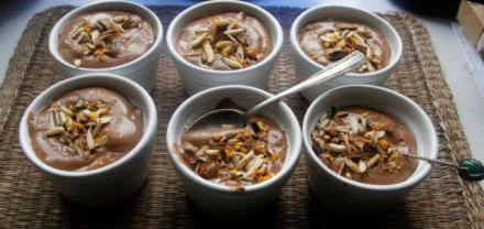 Takie deser będzie ozdobą każdego obiadu. Wybitnie poprawia humor. Zwracam uwagę na użycie tzw. gorzkiej czekolady (w odróżnieniu od przepisu z książki Alicji B. Toklas). Musi być naprawdę dobrego gatunku i o wysokiej zawartości kakao. Uważa się, że taka czekolada działa dobrze na krążenie i koi nastroje depresyjne. Na pewno łagodzi zimowe klimaty. Kto chce, może przybrać mus listkami świeżej mięty lub melisy (np. zamiast skórki pomarańczy). Zwłaszcza mięta tworzy z czekoladą wyjątkowo szczęśliwy związek smakowy.