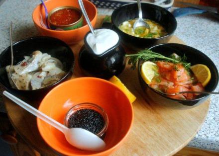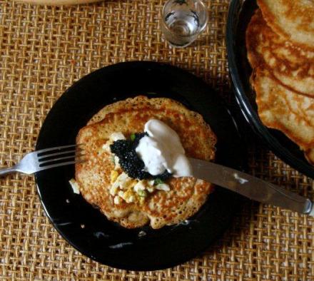 A dodatki? Wszyscy przy blinach piszą o kawiorze – w tym dziewiętnastowieczna pani Mołochowiec – niech będzie kawior. Nie stać nas było na najdroższy czarny z bieługi (rodzaj jesiotra). Poprzestaliśmy na ikrze z łososia i czarnej ikrze ryb morskich. Wcale też nie są tanie, choć tańsze. Niektórzy przy tym uważają, że ikra czerwona to nie jest kawior. Ja się z tym nie zgadzam, ale dla porządku podaję tę opinię.