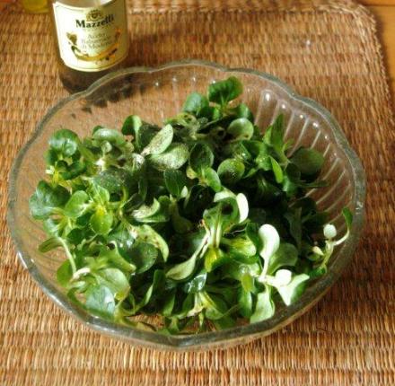 Wypijając kolejny łyk sherry, przyrządziłam sałatę. Była to roszponka, czyli po francusku mâche. Ma drobne zaokrąglone listki, a smak bardzo przyjemny. Jest jak aksamit. Bajkę o roszponce znamy z kart baśni braci Grimm. W moim blogu jest już dokładniej opisana, można odnaleźć. Umytą i dokładnie wysuszoną roszponkę skropiłam oliwą i kilkoma kropelkami balsamico z Modeny. Pieprz, odrobina soli w ostatniej chwili przed podaniem, bo ta sałata jest bardzo delikatna i od octu oraz soli szybko więdnie.