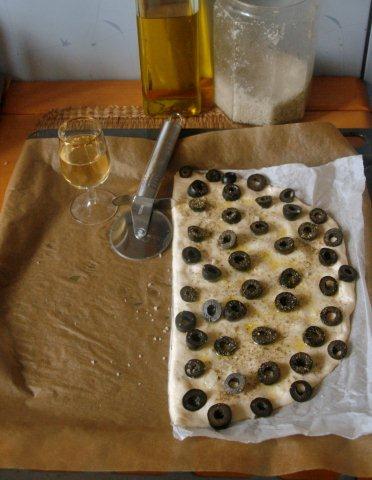 Zrobiłam tak: poprosiłam domowego sommeliera o nalanie mi lampki sherry, czyli hiszpańskiego wina jerez (a nie „cherry” czyli wiśniówki, jak niektórym się myli). Wyjęłam z piekarnika blaszkę, wyłożyłam ją papierem do pieczenia. Ciasto na focaccię odpakowałam, ułożyłam na blaszce. Wypiłam kolejny łyk sherry. Ciasto posmarowałam oliwą, nałożyłam na nie czarne oliwki pokrojone w krążki – można takie kupić gotowe, są nawet tańsze od całych. Całość posypałam grubą solą morską oraz suszonymi ziołami. Było to oregano, ale może być rozmaryn lub inne zioła; może być ostra papryka. To wszystko. Piekłam zgodnie z przepisem na opakowaniu.