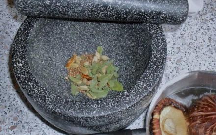 Wyciągamy moździerz. Wsypujemy do niego przyprawy. W moim zestawie były: ziarna kolendry, listki curry, kardamon, suszona papryczka chili, suszona skórka pomarańczowa, kawałek suszonego korzenia imbiru, pieprz. Starłam je na proszek, nie przejmując się, że niecałkowicie. Zestaw przypraw można dopasować do swoich zapasów. Wystarczy przejrzeć półkę z przyprawami i ruszyć głową.