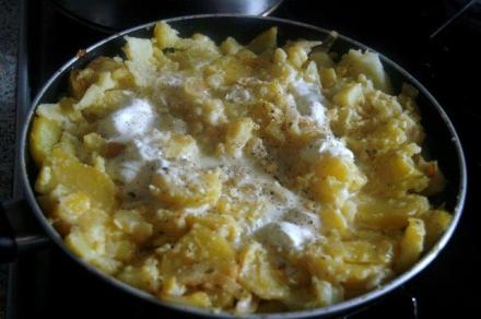 Na patelni rozgrzać oliwę, włożyć ziemniaki pozostałe z poprzedniego dnia. Zmniejszyć temperaturę, ziemniaki zagrzać, ale nie rumienić ich. Można je lekko rozgrzać widelcem. Gdy będą ciepłe, wlać śmietanę wymieszaną z pieprzem, startą gałką muszkatołową oraz ew. solą. Wymieszać, ale tak, aby śmietana była widoczna. Mocno zagrzać, od razu podawać na stół wprost na patelni. Kto chce potrawę wzbogacić, może ją posypać startym serem typu gruyère.