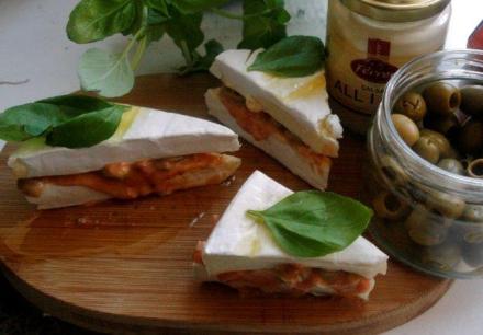 No cóż, pasty z oliwek też nie miałam. A co było w lodówce? Znalazłam pastę pomidorową do bruschetty, czosnkowy sos ailoli i zielone oliwki. Oliwki pokroiłam w cienkie plasterki, szybko wymieszałam z pastą pomidorową i aioli. Posmarowałam połówkę sera, przykryłam drugą. Skropiłam oliwą i przybrałam listkami bazylii.