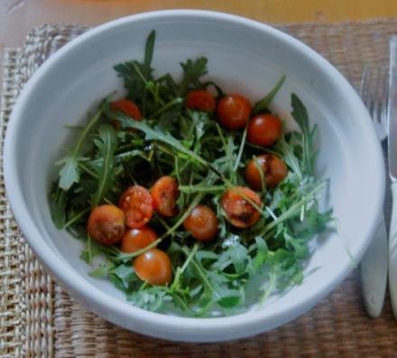 Do sera można podać pieczywo, chyba że się z naszym gościem odchudzamy (sam ser jest już kaloryczny). Ale może akurat na węglowodany machamy ręką. Gdy znalezione pieczywo jest niezbyt świeże, warto kromki skropić oliwą, ewentualnie posmarować roztartym czosnkiem, i zapiec na grzanki. A kto ma, niech koniecznie poda i sałatę. Ja miałam rukolę i małe koktajlowe pomidorki. Sałatę z oliwą i kroplą octu balsamico można wymieszać już przy stole. I gadać, gadać, zajadając drobną serową przekąskę, której wykonanie zabrało pięć minut.