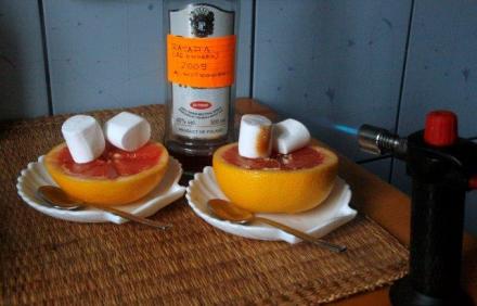 Zdjęcia przez mnie zrobione pokazują, jak podaję grejpfruty na deser, po mięsnym obiedzie. Bardzo do nich pasuje alkohol. Jednym z nich była ratafia wyrobu naszych Przyjaciół. Pod rękę z grejpfrutem smakowała naprawdę wybornie. Oczywiście, inny mocny alkohol też będzie w porządku. Osłodziłam grejpfruty kostkami marshmallows, skarmelizowanymi opalarką. Drugim (na zdjęciu grejpfruty z listkami melisy) był ciemny rum. Także był wyborny. Kto woli słodsze klimaty, może cierpkość owoców zrównoważyć słodkością. Lepiej użyć jakiegoś syropu (klonowego, z buraków, z agawy) albo miodu, niż po prostu cukru.