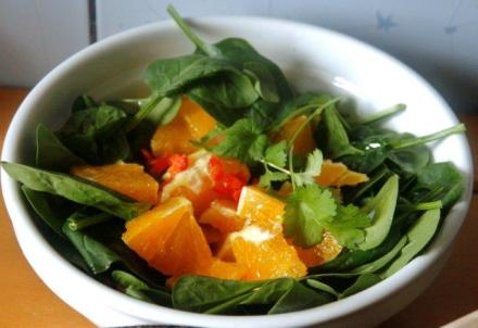 Szpinak umyć, przebrać, osuszyć. Kto chce, może odciąć łodyżki. Liście ułożyć w salaterce. Dodać cząstki pomarańczy oczyszczone z błonek i drobno skrojoną papryczkę chili. Doprawić oliwą, skropić octem ryżowym. Do smaku posolić i popieprzyć. Na końcu posypać całymi listkami natki, aby jej smak był dobrze wyczuwalny.