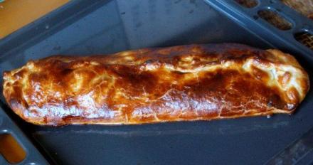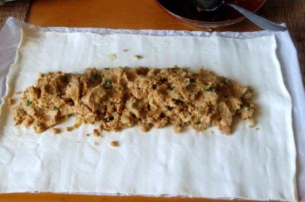 Zawinęłam je, łącząc u góry i tworząc na połączeniu falkę. Pewnie można to wykonać daleko bardziej ozdobnie, jeśli się potrafi (wyciąć z ciasta jakieś listki itd.). Zawinięte ciasto nakłułam widelcem (farsz paruje) i posmarowałam rozbełtanym jajkiem.