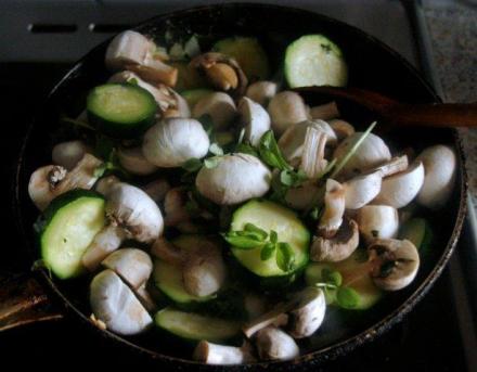 Może zastosować schłodzone ciasto na pizzę? Ale ja użyłam francuskiego. Na rozpostarty prostokąt ciasta nałożyłam farsz tak, aby pozostawić lekko uniesiony brzeg. Farsz nieskomplikowany. Na podduszoną w oliwie cebulkę i czosnek wrzuciłam pieczarki przekrojone wraz z nóżkami na pół i plasterki cukinii. Pieczarki oczyściłam obierając skórkę. Cukinie zostawiłam ze skórką. Do warzyw dodałam pokrojone pomidory z kartonika. A także dobre parówki cielęce (można się bez nich obejść). Powstał placek z gruntu warzywny, ni to włoski, ni to prowansalski.